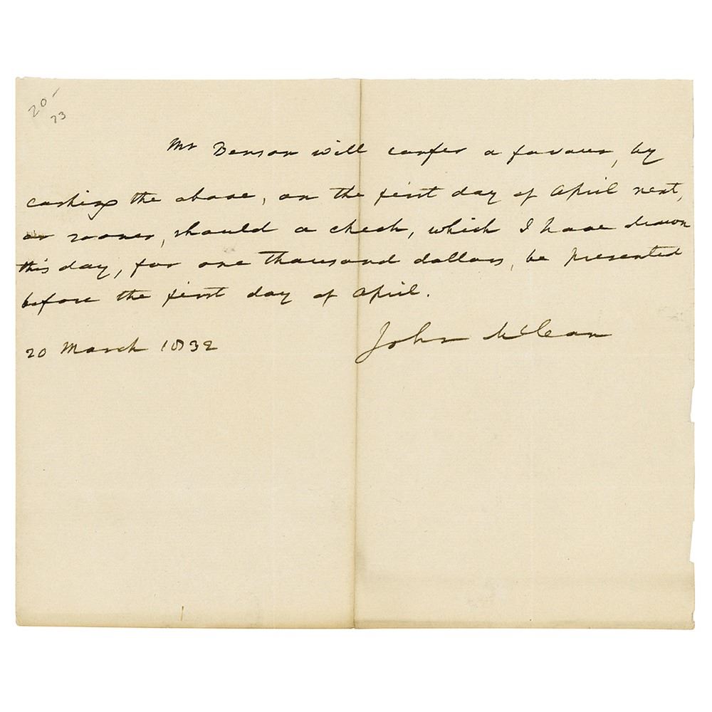 American jurist and politician (1785-1861) who served in Congress, as postmaster general, and as an associate justice of the Supreme Court. ALS, one page, 8 x 6.5, March 20, 1832. Handwritten letter concerning a financial transaction, in full: "Mr. Benson will confer a favour, by cashing the above, on the first day of April next, or sooner, should a check, which I have drawn this day, for one thousand dollars, be presented before the first day of April." In fine condition, with a central vertical fold.