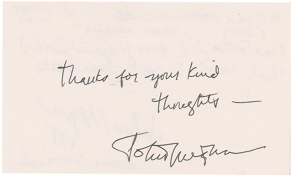 Child actor who played Dill in To Kill A Mockingbird and a young Hyman Roth in The Godfather: Part II. He died in 1995 from complications of AIDS. Ink signature, “Thanks for your kind thoughts—John Megna,” on an off-white 5 x 3 card. In fine condition.
