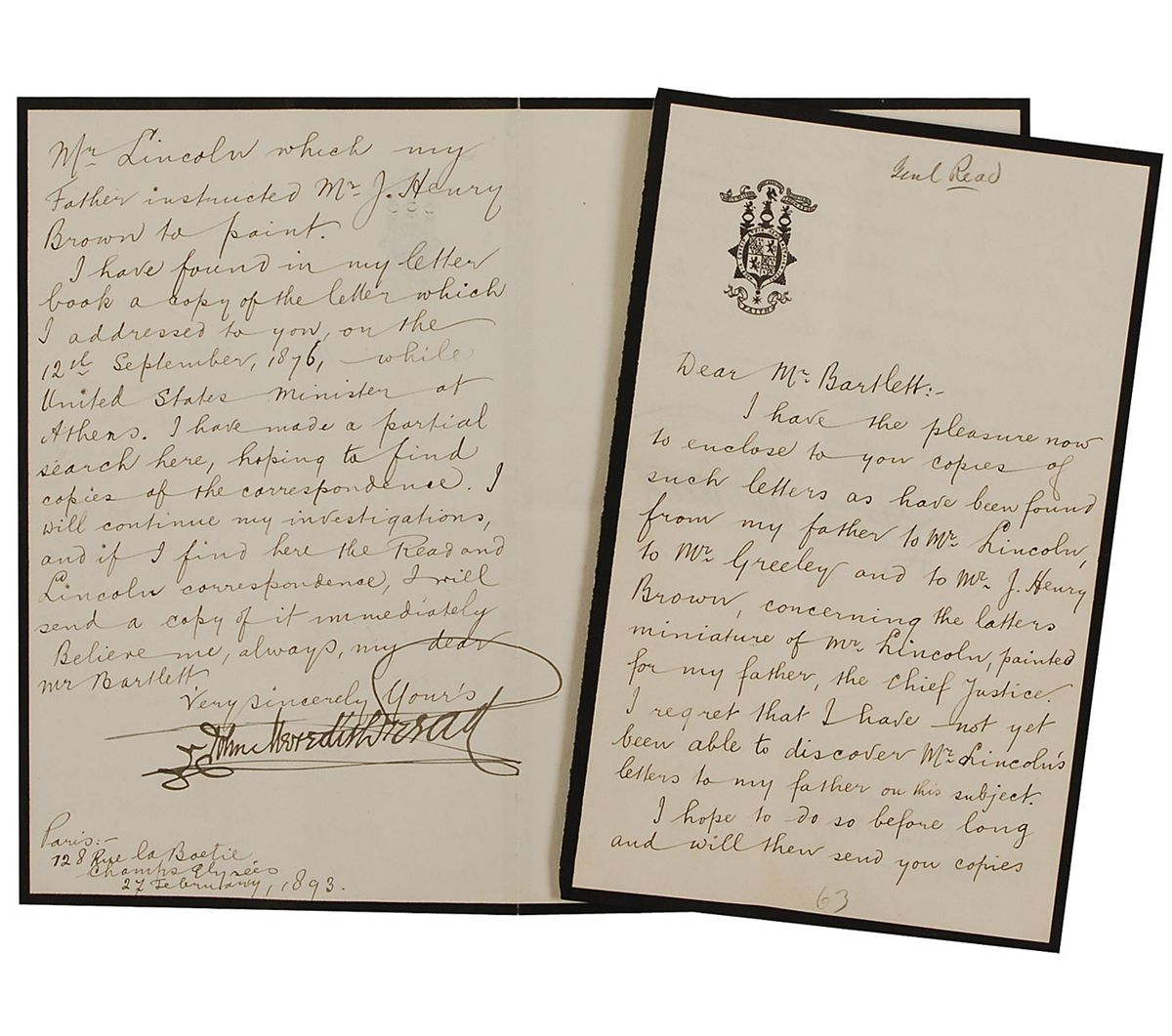 Son of the prominent Pennsylvania jurist and ardent supporter of Lincoln during the 1860 campaign, he served as an adjutant general during the Civil War and later became a diplomat (1837–1896). Two LSs, each one page both sides, 5 x 8, Paris, February 27 and April 11, 1893. Letters regarding a portrait of Lincoln. The first, in part: “I have written requesting copies to be sent to me of the correspondence which passed between President Lincoln and my Father, Chief Justice John Meredith Read, touching the miniature of Mr. Lincoln which my Father instructed Mr. J. Henry Brown to paint.” The second, in part: “I have the pleasure now to enclose to copies of such letters…from my father to Mr. Lincoln, to Mr. Greeley and to Mr. J. Henry Brown, concerning the latters miniature of Mr. Lincoln…I regret that I have not yet been able to discover Mr. Lincoln’s letters on the subject.” In overall fine condition, with central vertical and horizontal folds passing through the signatures, and a couple pencil notations to one letter.