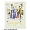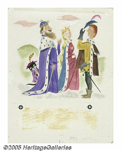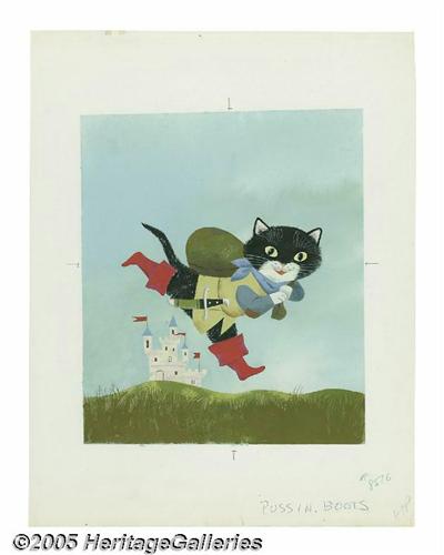 <B>John Miller -Little Golden Book #137 Puss In Boots Cover and Story Illustration Original Art, Group of 22 (Simon and Schuster, 1952).</B></I> Once upon a time, a miller died leaving the mill to his eldest son, his donkey to his second son, and a cat to his youngest son. The eldest son kept the mill, the second son took the donkey and set off in search of his fortune, while the third sat down on a stone and sighed, "A cat! What am I going to do with that?" The cat heard his words and said, "Don't worry, Master. What do you think? That I'm worth less than a half-ruined mill or a mangy donkey? Give me a cloak, a hat with a feather in it, a bag and a pair of boots, and you will see what I can do." John Miller's delightful cover and interior illustrations for <B>Puss In Boots</B></I> bring the adventures of the clever cat to life. The cover illustration has an image area of 7" x 9" , while the interior illustrations have an approximate image area of 6" x 6.5". The illustrations were painted on board, but some of the paintings have only the top paper surface and not the support board. Many of the type-set captions have slipped off the illustrations; otherwise the art averages a Very Good condition. A pasted-up layout for an alternate cover is included in this lot. <I>From the Random House Archives</B></I>.