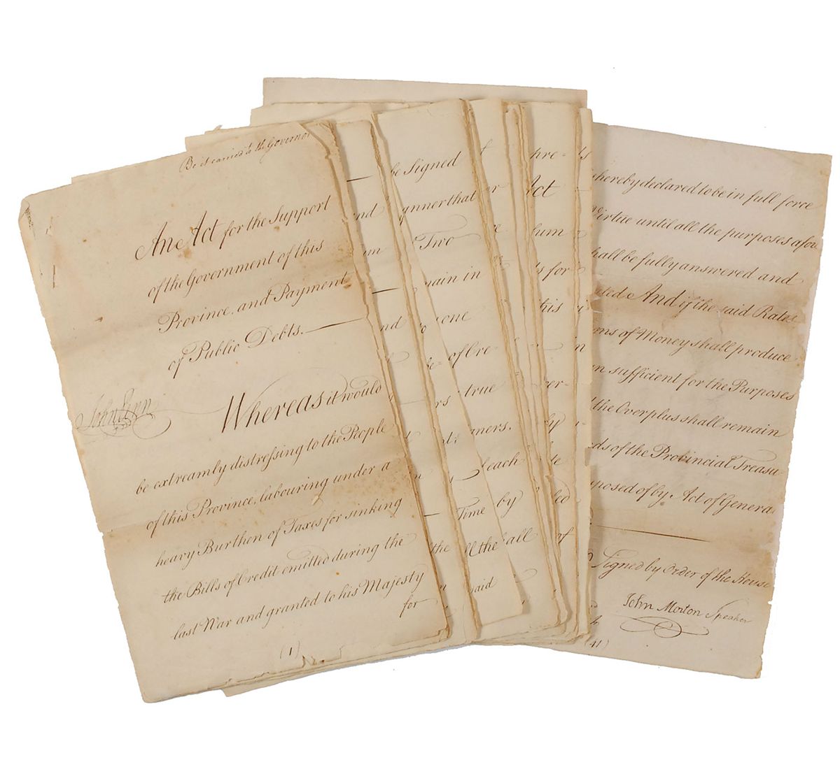 Morton (1725–1777) was a delegate to the Continental Congress and provided the swing vote that put Pennsylvania in favor of the Declaration of Independence, which he also signed. Penn (1729–1795) served as the last governor of colonial Pennsylvania. Revolutionary War–dated manuscript DS, 41 pages, 7.5 x 12.5, September 30, 1775. Document entitled “Act for the Support of the Government of this Province and Payment of Public Debts.” Document begins, in part: “Whereas it would be extremely distressing to the people of this province, laboring under a heavy burden of taxes for sinking the bills of credit emitted during the last war and granted to His Majesty for the protection of His American dominions, to impose on them an additional rate or tax to be immediately levied on their real and personal estates: And whereas it is necessary to raise a sum for supporting the honor of government, discharging its debts and incidental expenses, and preserving the public credit: We the representatives of the freemen of the said province do therefore pray that it may be enacted.” Signed on the first page by John Penn as the last colonial governor of Pennsylvania and at the conclusion by John Morton as speaker of the Pennsylvania House of Representatives. Also signed at the conclusion by Joseph Shippen, Jr., as secretary of the province. Professionally repaired paper loss to last two pages (affecting a few words but not signatures), and some chipping to edges, otherwise fine condition; overall writing, including the signatures, is extremely crisp and bold.