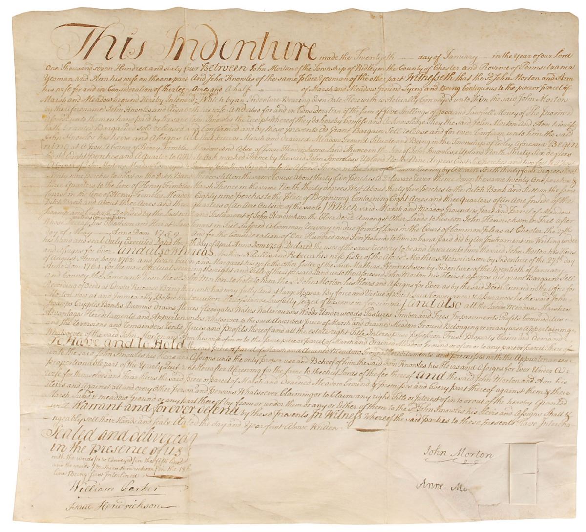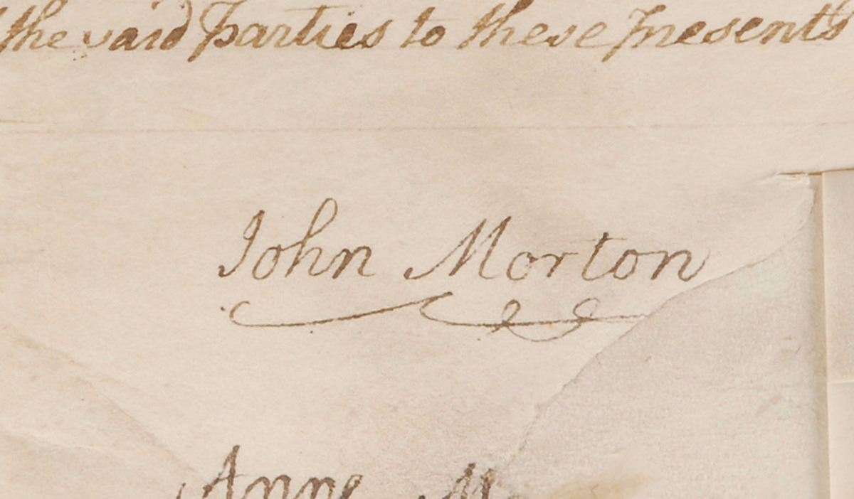 Signer of the Declaration of Independence from Pennsylvania (1725–1777). Vellum manuscript DS, one page, 16.25 x 15.25, January 20, 1764. An indenture for a deed of land in which “John Morton of the Township of Ridley in the County of Chester and Province of Pennsylvania…in consideration of thirteen acres and a half…is conveyed unto him…by the aforenamed John Knowles” for a sum of five shillings. Signed at the conclusion by Morton. In very good to fine condition, with a repaired area of paper loss under Morton’s signature affecting his wife’s last name. Of the fifty-six delegates to sign the Declaration of Independence, Morton earns the distinction of being the very first to die, an unfavorable credit which has since made his signature all the more rare and desirable.