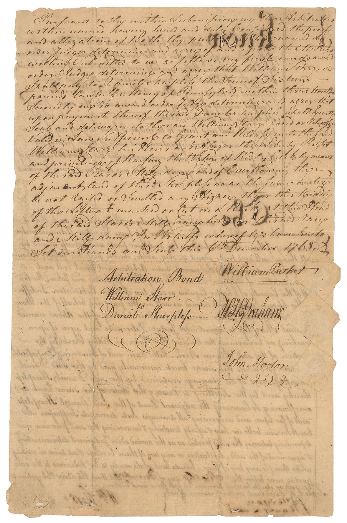 Signer of the Declaration of Independence from Pennsylvania (1725–1777) who also chaired the committee that wrote the Articles of Confederation. Manuscript DS, one page both sides, 8 x 12.75, December 6, 1768. Arbitration bond from William Starr to Daniel Sharpless in the amount of one hundred pounds, associated with "raising the Water in Ridley Creek by the erection of the said William Starr's Mill Dam and of Rendering Impassable a certain ford across the same creek commonly used by the said Daniel Sharpless." Signed at the conclusion by Morton. In very good to fine condition, with ink erosion affecting some text, but not Morton's signature, and professionally silked on both sides for reinforcement.