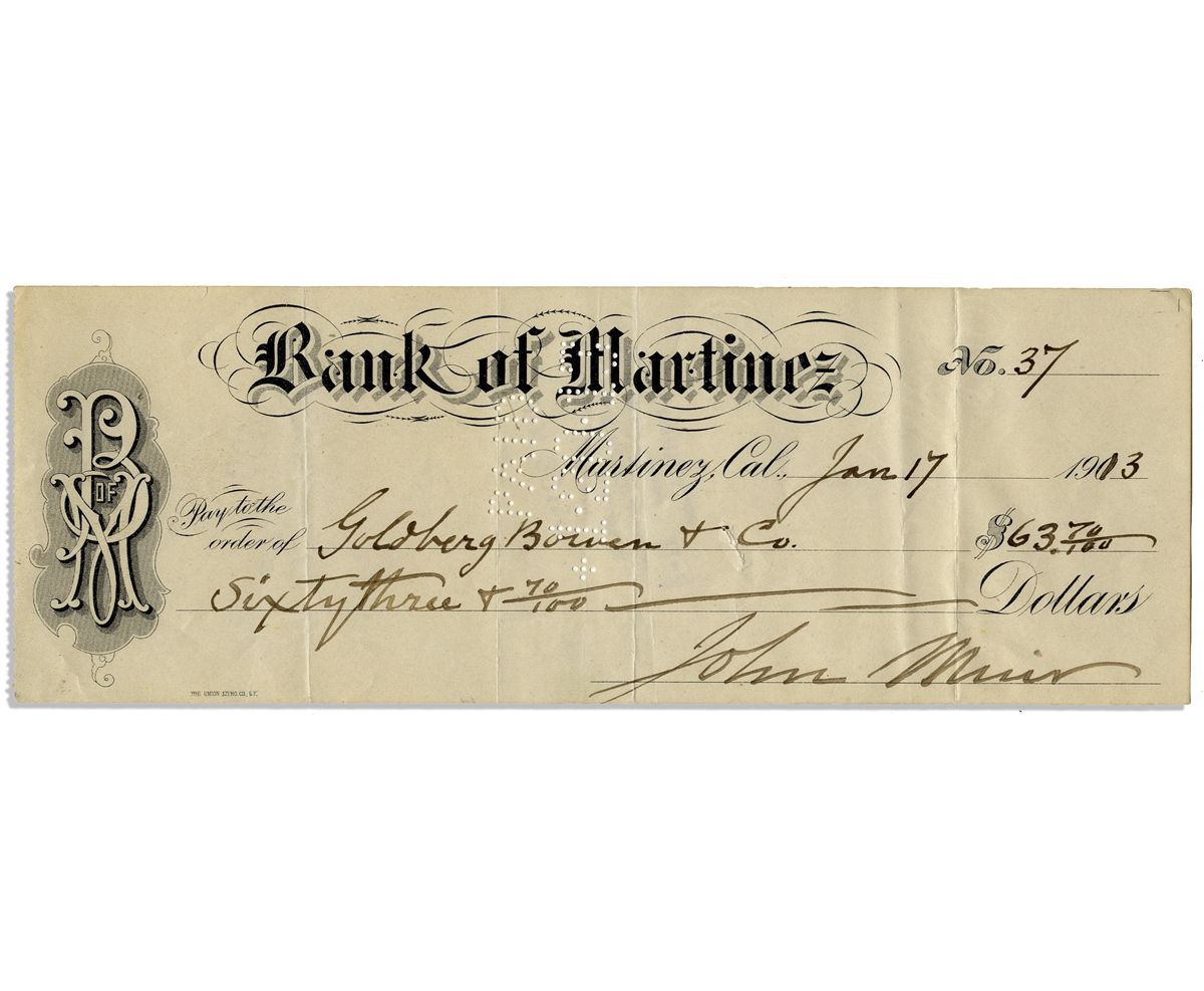 Check signed ''John Muir'', dated 17 January 1913, the year before the great conservationist's death. Bank of Martinez check is made out to Golberg Bowen & Co., in the amount of $63.70. Measures 8.75'' x 3.25''. Creasing and standard bank markings, else near fine.