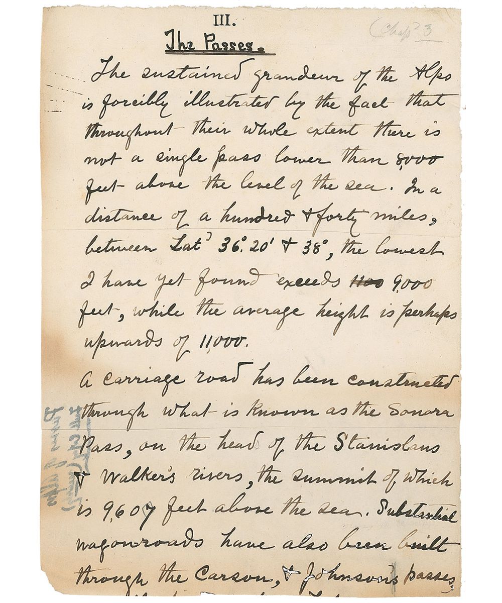 Partial autograph manuscript, one page, 8.25 x 11.75, part of a page from Muir’s working draft of The Mountains of California. Headed at the top, “III. The Passes,” Muir writes, in full: “The sustained grandeur of the Alps is forcibly illustrated by the fact that throughout their whole extent there is not a single pass lower than 8,000 feet above the level of the sea. In a distance of a hundred & forty miles, between Lat 36° 20' & 38°, the lowest I have yet found exceeds 9,000 feet, while the average height upwards of 11,000. A carriage road has been constructed through what is known as the Sonora Pass, on the head of the Stanislaus and Walker’s rivers, the summit of which is 9,607 feet above the sea. Substantial wagon-roads have also been built through the Carson & Johnson passes.” On the reverse, Muir has penned “Passes of Alps Full Copy (nearly).” In very good condition, with tape reinforcement to reverse of horizontal folds and some light edge toning.