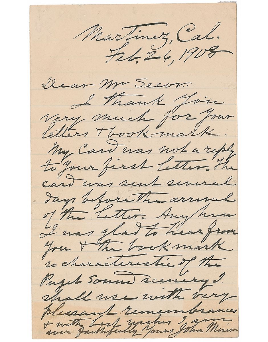 ALS, one page, lightly-lined, 5 x 8, February 26, 1908. Letter to artist David Pell Secor. In full: “I thank you very much for your letters & book mark. My card was not a reply to your first letter. The card was sent several days before the arrival of the letter. Anyhow I was glad to hear from you & the book mark so characteristic of the Puget Sound scenery I shall use with very pleasant remembrances & with best wishes I am ever Faithfully Yours.” In fine condition, with some mild toning along bottom edge and mounting remnants to reverse of second integral page.