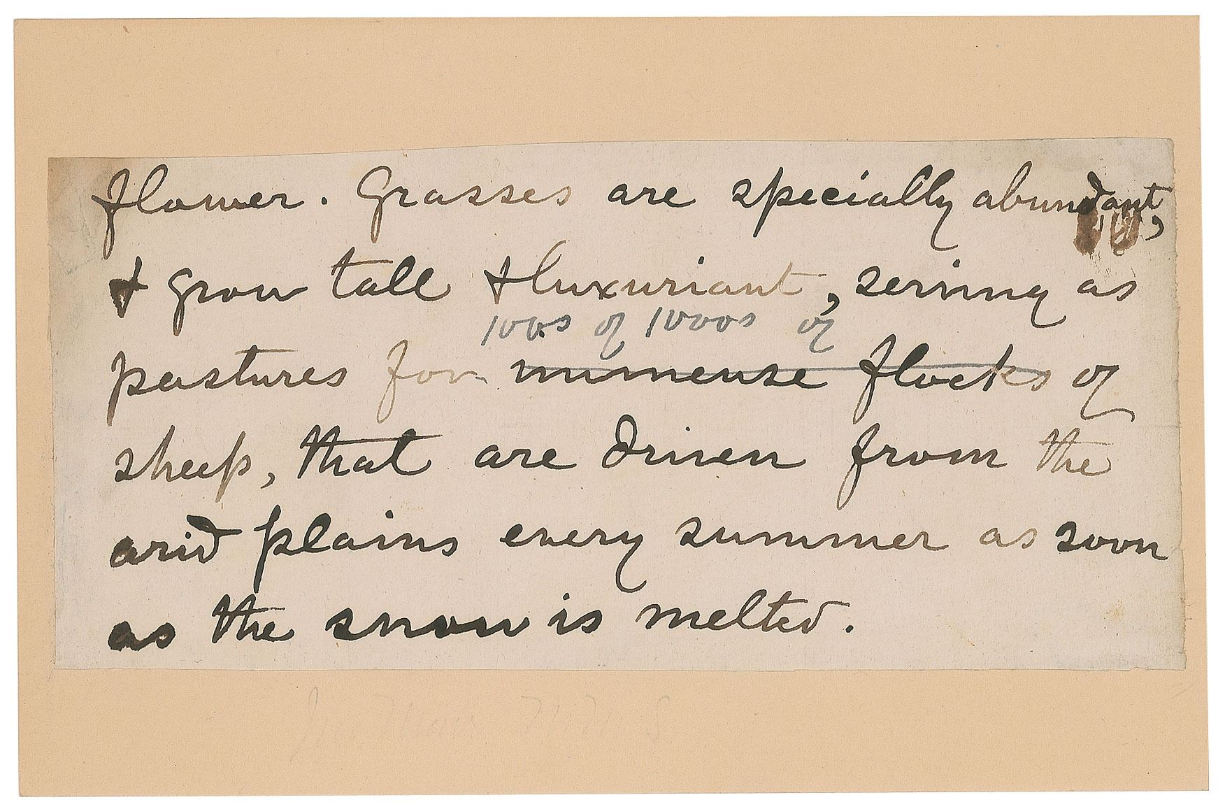 Naturalist and author (1838–1914) who helped establish Yosemite National Park. Boldly penned handwritten manuscript from Muir's working manuscript of 'The Mountains of California' on an off-white 8.75 x 4 sheet, no date but published (with revisions) in October 1894. In full: "flower. Grasses are especially abundant & grow tall & luxuriant, serving as pastures for 100s of 1000s of sheep, that are driven from the arid plains every summer as soon as the snow is melted." In fine condition, with some light edge toning.