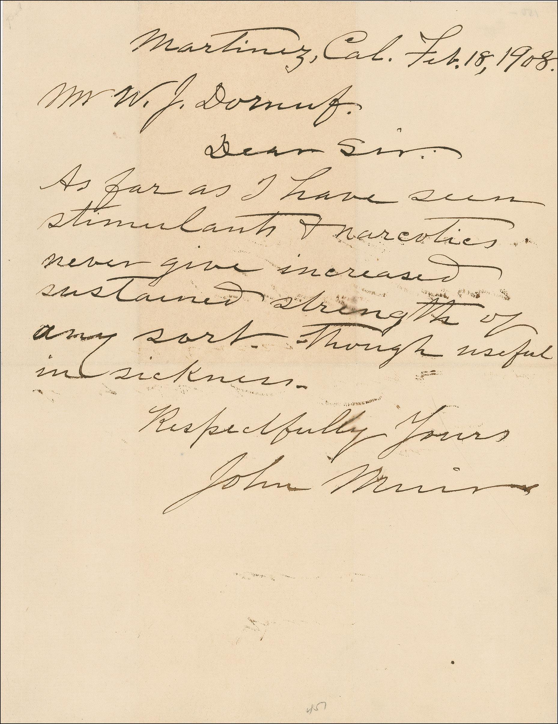 Naturalist and author, Muir gained the establishment of Yosemite National Park. ALS, one page, 8.5 x 11, February 18, 1908. Letter to Minnesota journalist W. J. Dornuf. In full: “As far as I have seen stimulants & narcotics never give increased sustained strengths of any sort, though useful in sickness.” In fine condition, with intersecting folds, one through a single letter of signature, light mirroring of ink from premature folding, and some mild toning. Pre-certified PSA/DNA and RRAuction COA.
