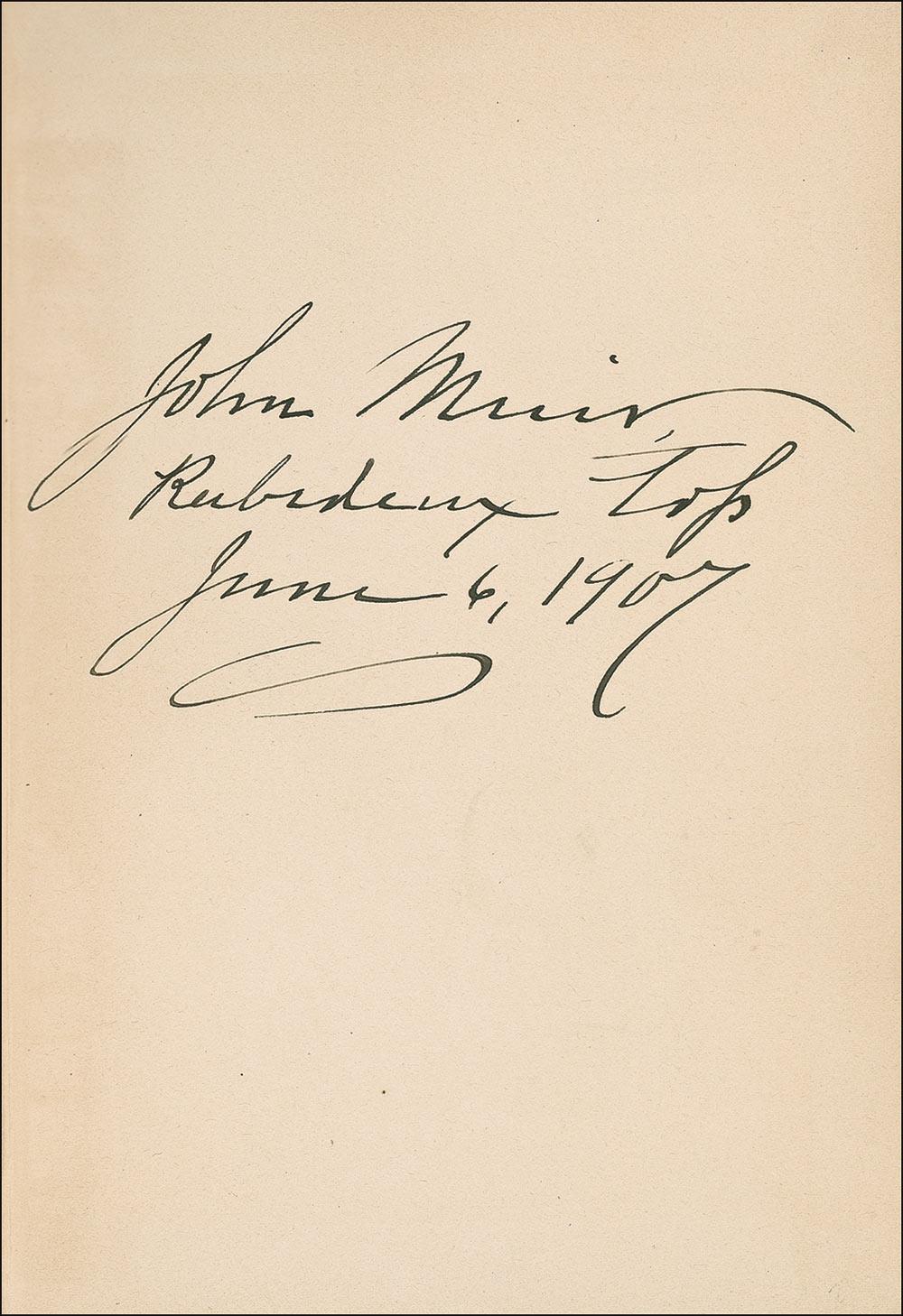 Naturalist and author, Muir gained the establishment of Yosemite National Park. Signed book: The Mountains of California. Later printing. NY: The Century Co., 1904. Hardcover, 5.5 x 8, 381 pages. Signed on the first free end page, “John Muir, Rubidoux Top, June 6, 1907.” In fine condition, with a former owner’s bookplate affixed to inside front cover, a mild shade of toning to signed page, some scattered light wear to covers, and mild soiling to the spine.