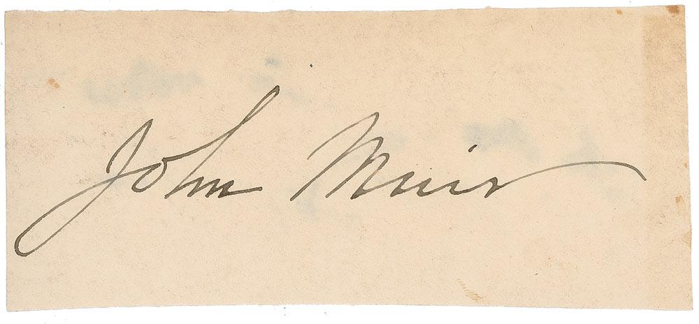 Naturalist and author who gained the establishment of Yosemite National Park. Fountain pen signature on an off-white 5.25 x 2.25 slip. In fine condition, with strip of toning along the right edge and show-through from paper remnants on the reverse from past display. Accompanied by an unsigned photo suitable for matting.