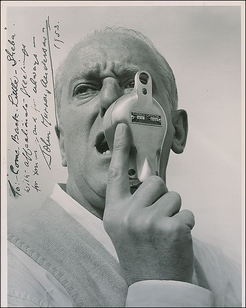 Multi-faceted mogul of show business (1886–1954) who assumed the various roles of theatre director and producer, songwriter, actor, screenwriter, and lighting designer in vaudeville, on Broadway, and in film. Scarce vintage glossy 8 x 10 photo of Anderson speaking into a microphone, signed vertically in fountain pen, “To: ‘Come Back Little Sheba,’ With affectionate greetings for Xmas and for always, John Murray Anderson, 1953.” In fine condition, with a few trivial creases and a small tear to the right edge.