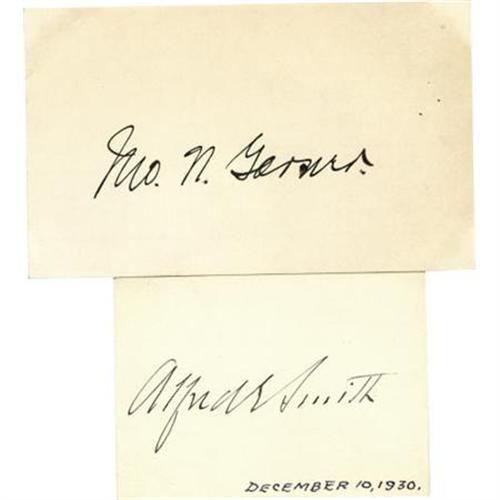 <B>John N. Garner and Alfred E. Smith Signed Cards</B></I>. Individually signed cards,<B> "</B></I><I>John N. Garner </B></I>" and "<I>Alfred E. Smith </B></I>",<B> </B></I>measuring 5" x 3" and 3.5" x 2.5", signed by Vice President John Garner and Democratic Presidential Nominee Alfred Smith, light fading on both cards. Accompanied by ephemera from previous collector.<BR><BR><BR><b>Shipping:</b> Flat Material, Small (<a target="_blank" href="http://www.heritageauctions.com/common/shipping.php">view shipping information</a>)