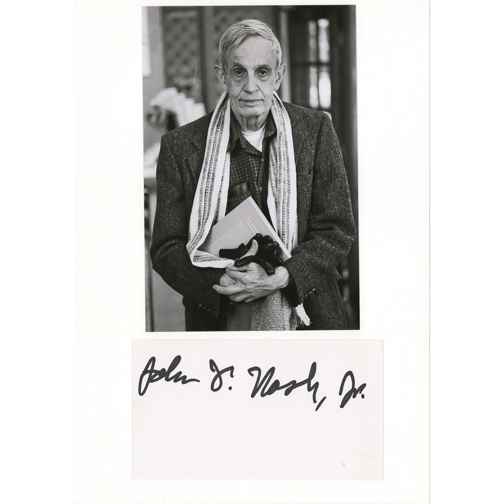 Felt tip signature, "John F. Nash, Jr.,‰Û on an off-white 5.75 x 3.25 card affixed to a larger white sheet bearing an applied photo. In fine condition.