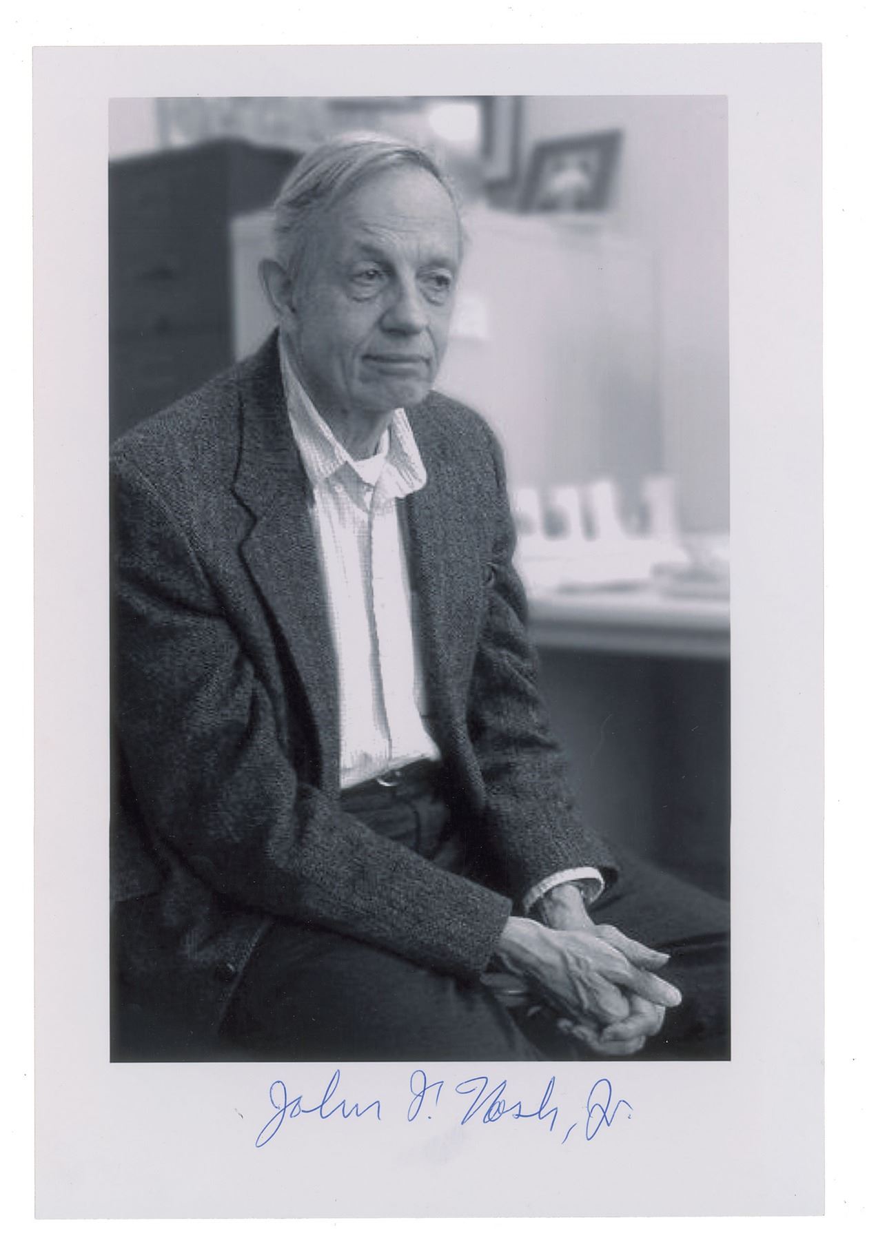 American mathematician (1928–2015) who made fundamental contributions to game theory, differential geometry, and the study of partial differential equations; he is the only person to be awarded both the Nobel Memorial Prize in Economic Sciences and the Abel Prize. Nash's struggles with paranoid schizophrenia became the basis for Sylvia Nasar's biography, A Beautiful Mind, which was later adapted into an Oscar-winning movie. Glossy 8 x 12 photo of Nash in a calm seated pose, signed in the lower border in blue ballpoint, "John F. Nash, Jr." In very fine condition.