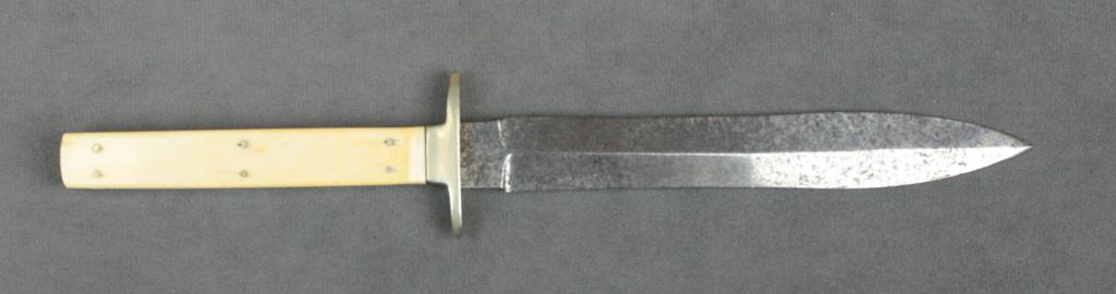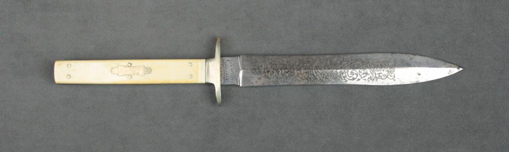John Nesbitt maker marked Sheffield knife  approx. 10-1/2” overall with an approx.  6-1/2” blade with etching on one side in a  tasteful vine pattern, ivory pinned grips  with escutcheon  in overall very good +condition showing scattered spots of light  erosion, clear maker markings, fine aged  grips, simple German silver cross guard.   Est.:  $300-$600.