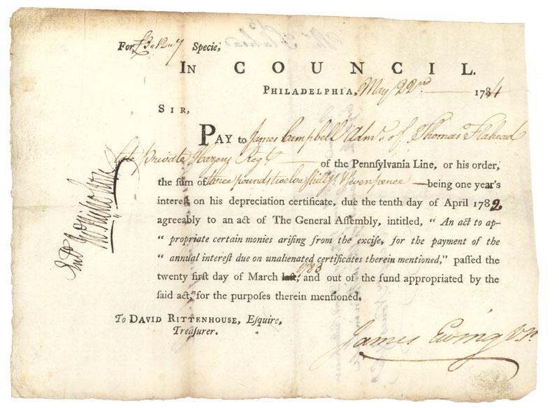 1784, Pennsylvania. 8 1/2" x 6". Partly printed Council certificate in which David Rittenhouse is directed to pay "James Campbell Adm. Of Thomas Flahead late Private , of the Pennsylvania Line,...one year's interest on his depreciation certificate." Countersigned by JOHN NICHOLSON (d. Dec. 5, 1800), Comptroller general of Pennsylvania; with Robert Morris formed numerous land companies. These certificates were issued to pay the interest on depreciation certificates that had been previously issued to compensate soldiers on unpaid back pay and make up losses suffered by the troops from having been paid in depreciated currency. An interesting document displaying some of the financial chaos which was prevalent during and after the war. Fine.