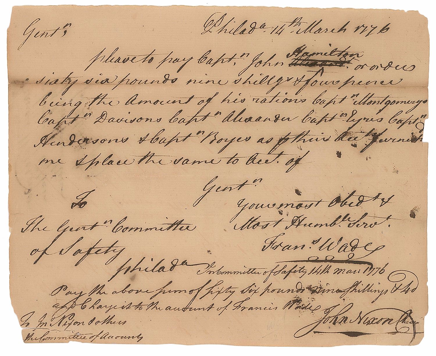 Financier and militia officer during the Revolutionary War (1733–1808) who made the first public proclamation of the Declaration of Independence from the steps of the Pennsylvania State House on July 8, 1776. Manuscript DS, signed "John Nixon," one page, 8 x 6.5, March 14, 1776. Nixon endorses a pay order calling for the Committee of Accounts to "pay Capt'n John Hamilton or order sixty six pounds nine shillings & four pence being the amount of his rations." Signed in the lower right by Nixon. In very good condition, with partial separations to folds, a few repairs to reverse (including a couple small repaired tears to signature area), and chipping to brittle edges. A fantastic document dating to the historic year of 1776.