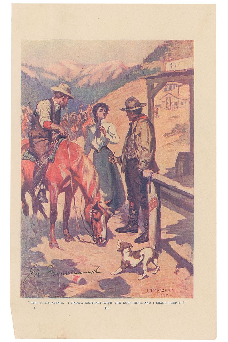 Painter, sculptor, and illustrator (1875–1921) heavily influenced by the west. Color 6 x 9.75 magazine photo of one of Marchand’s western scenes, signed in the lower left in black ink, “J. N. Marchand.” Affixed at the top to a slightly larger cardstock sheet. A light crease passing through a single letter of the signature, slight paper loss to lower left corner, and slight wrinkling to the upper border due to adhesive, otherwise fine condition.