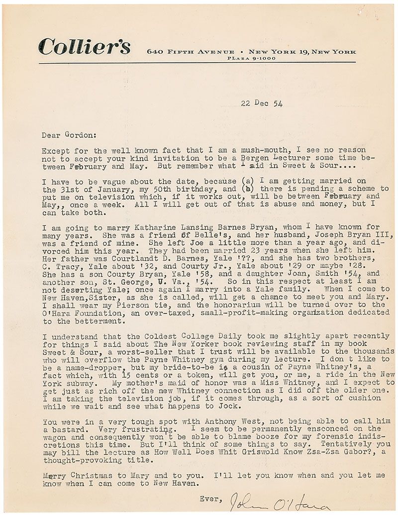 Writer (1905–1970) whose more notable works include Appointment in Samarra and Butterfield 8. TLS, one page, 8.5 x 11, Collier’s letterhead, December 22, 1954. Letter to Gordon. In part: “Except for the well known fact that I am a mush-mouth, I see no reason not to accept your kind invitation to be a Bergen Lecturer…I am going to marry Katharine Lansing Barnes Bryan…I understand that the Coldest College Daily took me slightly apart recently for things I said about The New Yorker book reviewing staff in my book Sweet & Sour, a worst seller that I trust will be available to the thousands who will overflow the Payne Whitney gym during my lecture…You were in a very tough spot with Anthony West, not being able to call him a bastard. Very frustrating. I seem to be permanently ensconced on the wagon and consequently won’t be able to blame booze for my forensic indiscretions this time.” Intersecting folds, some mild toning, and a staple hole to top right, otherwise fine condition. Accompanied by an unsigned candid of O’Hara and his second wife Belle, as well as Gordon’s letter to O’Hara.