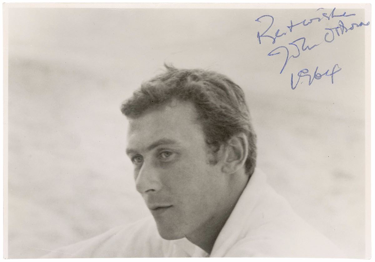 English playwright, screenwriter, and actor (1929–1994). Matte-finish 7.75 x 5.25 head-and-shoulders photo, signed in blue ballpoint, “Best wishes, John Osborne, 1964.” Light creases and a trimmed bottom edge, otherwise fine condition.
