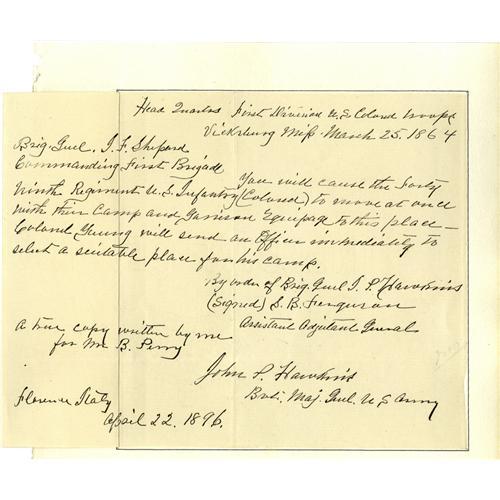 <B>John P. Hawkins Autograph Letter Signed</B></I> "<I>John P. Hawkins, Brig. Maj. Genl. U.S. Army.</B></I>" One page, handwritten document, measuring 7.8" x 6", dated March 25, 1864, from the Headquarters of the First Division of U.S. Colored Troops. Hawkins was a well-known Union general during the Civil War. He is most famous for commanding an all black unit. This letter contains content relating to the movement of a "colored unit." It reads in part, "<I>You will cause the forty ninth regiment U.S. Infantry (colored) to move at and with this camp and garrison…</B></I>" <BR><BR>The letter is in fine condition; the ink is as dark and crisp as the day it was written; the usual folds are present. A wonderful lot for those interested in the role of African-Americans in the Civil War.