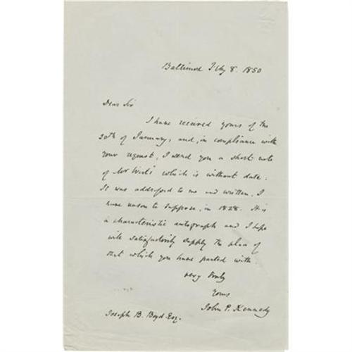 <B>John P. Kennedy, Secretary of the Navy, Autograph Letter Signed</B></I> "<I>John P. Kennedy</B></I>". One page, 5.5" x 8.5", Baltimore, February 8, 1850, to Joseph B. Boyd, with the usual fold creases, else fine. Kennedy responds to an autograph seeker and refers to forwarding him an example of "<B>Wirt's</B></I>" autograph. Further research may shed more light on who this gentleman may have been.<BR><BR><BR><b>Shipping:</b> Flat Material, Small (<a target="_blank" href="http://www.heritageauctions.com/common/shipping.php">view shipping information</a>)
