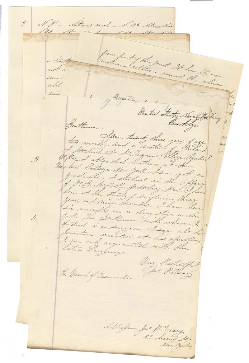 Application submitted to the Examining Board of Naval Surgeons as Assistant Surgeon. 5 pages. Treacy is able to “Describe the anatomy of the elbow joint” in detail and answers other questions in detail but is unable to answer the question “What are the alkaloids of opium and what are their properties?” Good medical content.