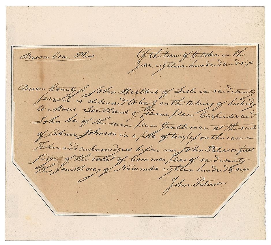 Major general in the Continental Army during the American Revolution (1744–1808) who later served as a U.S. Congressman from New York. ADS, one page, 7.75 x 5.25, November 4, 1806. Notification on a bail payment: "Broom County, John Hurlburt of Lish in said county farmer is delivered to bail on the taking of his body to Moses Southwick of the same place carpenter and John…of the same place gentleman at the suit of Abner Johnson in a plea of trespass." Signed neatly at the conclusion by Paterson. Professionally inlaid into a slightly larger sheet. In fine condition.
