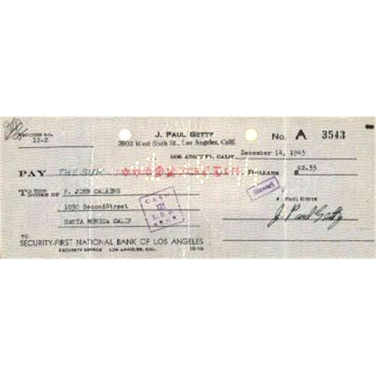 Check signed by oil magnate John Paul Getty. Signed Check dated 14 December 1943 measures 8.5'' x 3.25''. Bank cancellation markings, else near fine.