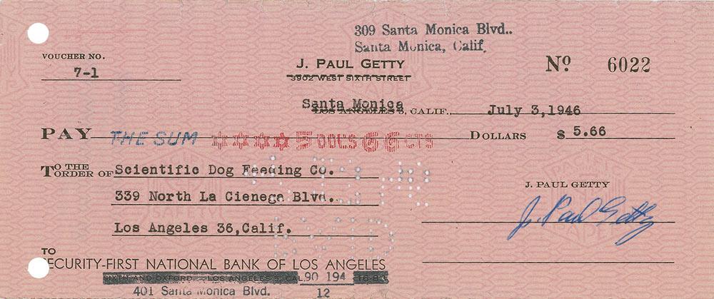 Personal check, 8.5 x 3.5, filled out in type and signed by Getty, “J. Paul Getty,” payable to Scientific Dog Feeding Co. for $5.66, July 3, 1946. In fine condition, with expected cancellation stamps and holes, none affecting the clean signature area.