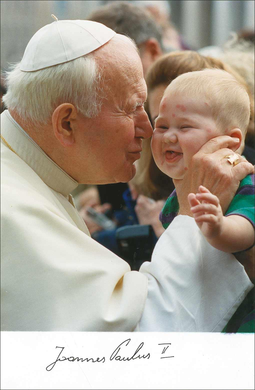 Exceptional oversized color glossy 8 x 12 photo of the Holy Father kissing an infant, signed in the lower border in black felt tip, “Joannes Paulus II.” Small crease to top right corner, otherwise very fine condition.