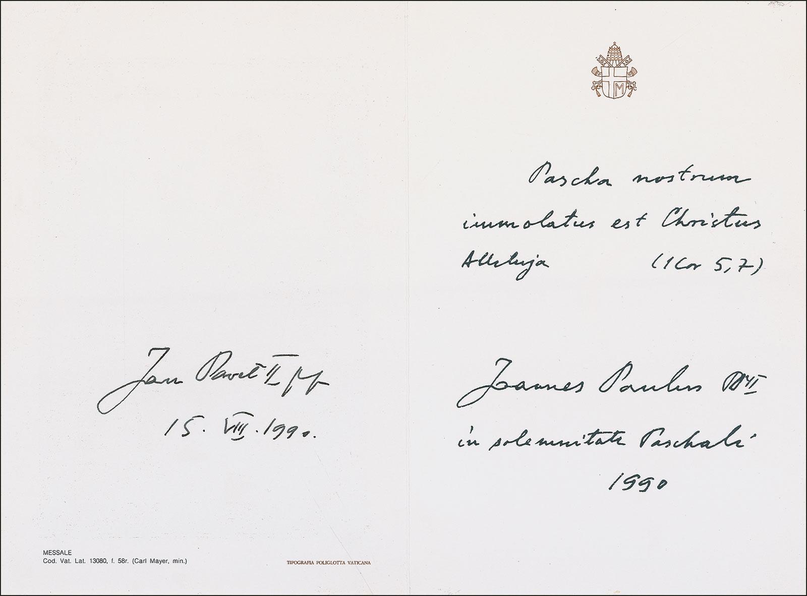 Spiritual card from 1990 measuring 4.5 x 6.5 closed, with the inside bearing a printed bible verse in Latin, as well as a printed signature, and also signed on the inside cover in ink, “Jan Pawel II pp, 15.VIII.1990.” In fine condition. Pre-certified PSA/DNA and RRAuction COA.