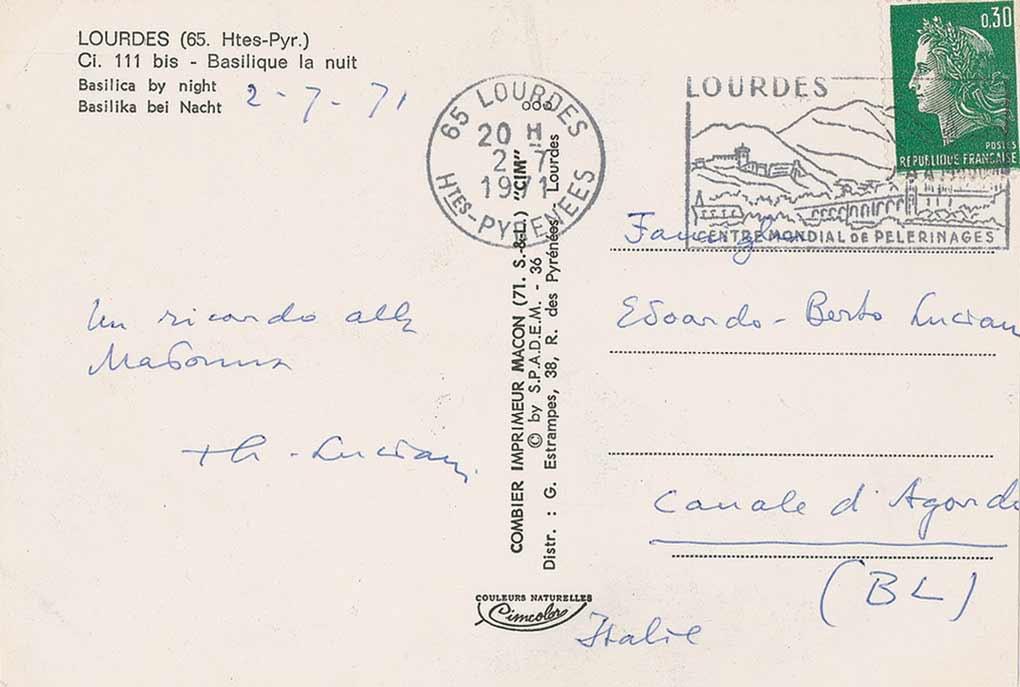 Born Albino Luciani. He was elected Pope on August 26, 1978. After Luciani's election, the mood appears to have been one of widespread optimism and John Paul established himself by taking the names of his two predecessors—John XXIII and Paul VI—to represent a combination of their qualities: one progressive, the other traditional. Eschewing the normally lavish coronation, John Paul quickly captured the media's support with an unplanned press conference, but this hopeful mood ended with his sudden death, of a heart attack, thirty-four days later. ANS in Italian, signed “A. Luciani,” one 5.75 x 4 pictured postcard of Lourdes, July 2, 1971. Brief note to his relatives in Italy, written as Cardinal and Patriarch of Venedig, “Un ricordo alla Madonna,” Luciani also address the postcard. In fine condition, with a crease to top left corner, and some light creasing to image side.