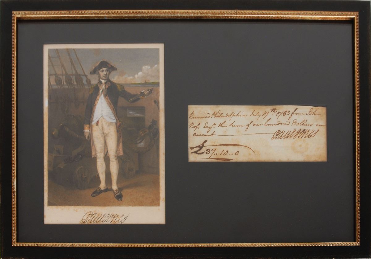 Autograph manuscript DS, signed “Paul Jones,” one page, 6.75 x 2.5, July 17, 1783. Receipt of payment, in full: “Received Philadelphia July 17th. 1783 from John Ross Esqr. the Sum of one hundred Dollars on account—Paul Jones, £37.10.0.” Archivally matted and framed with an engraving of Jones bearing a preprinted signature to an overall size of 18 x 12.25. In very good condition, with scattered overall toning not adversely affecting the boldness of the very rare signature. Jones remains exceedingly rare across all formats, with this handwritten receipt serving as only the second Jones-signed item we have ever offered, and the first instance of a signed document.