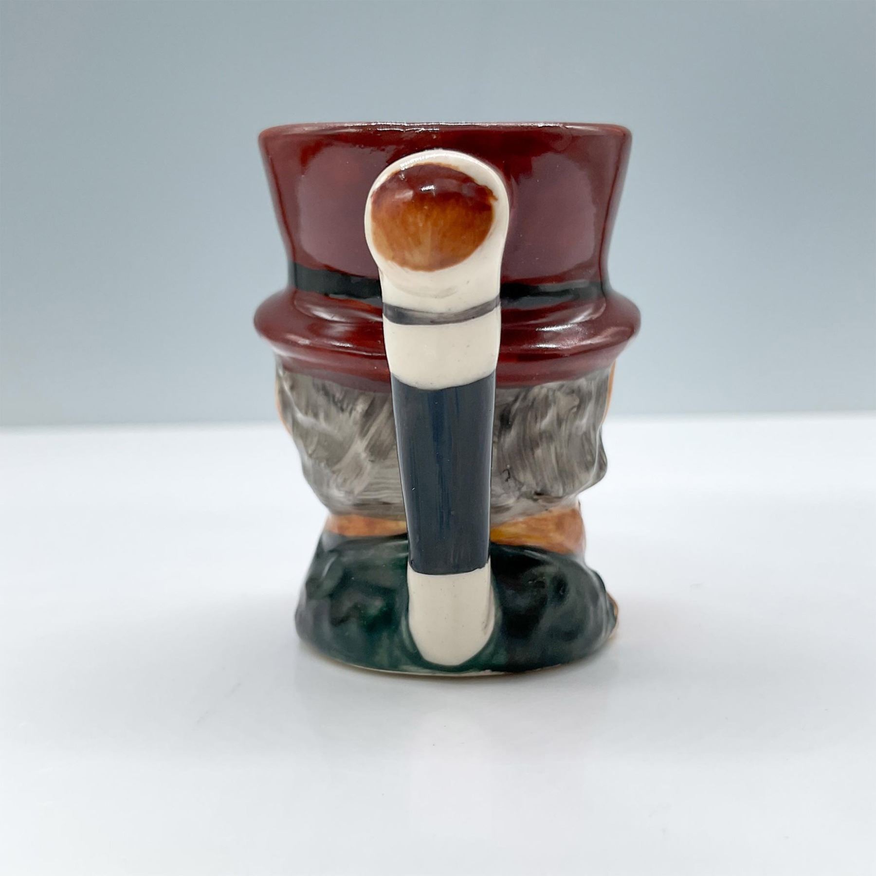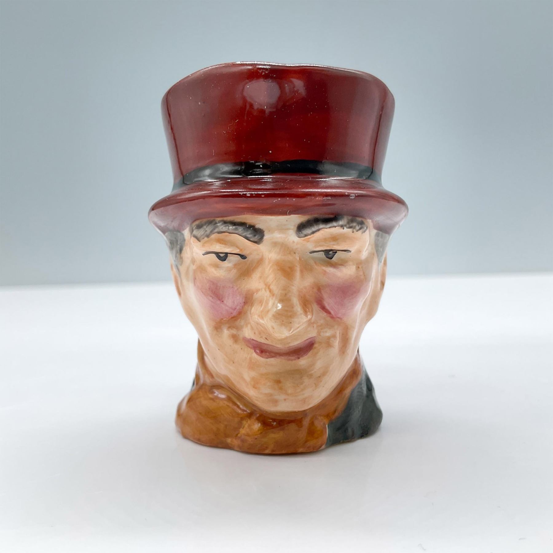 Figural jug of a man in a dark-green coat, orange scarf, dark brown hat with a black band. A riding crop and hunting horn as the handle. Royal Doulton backstamp.