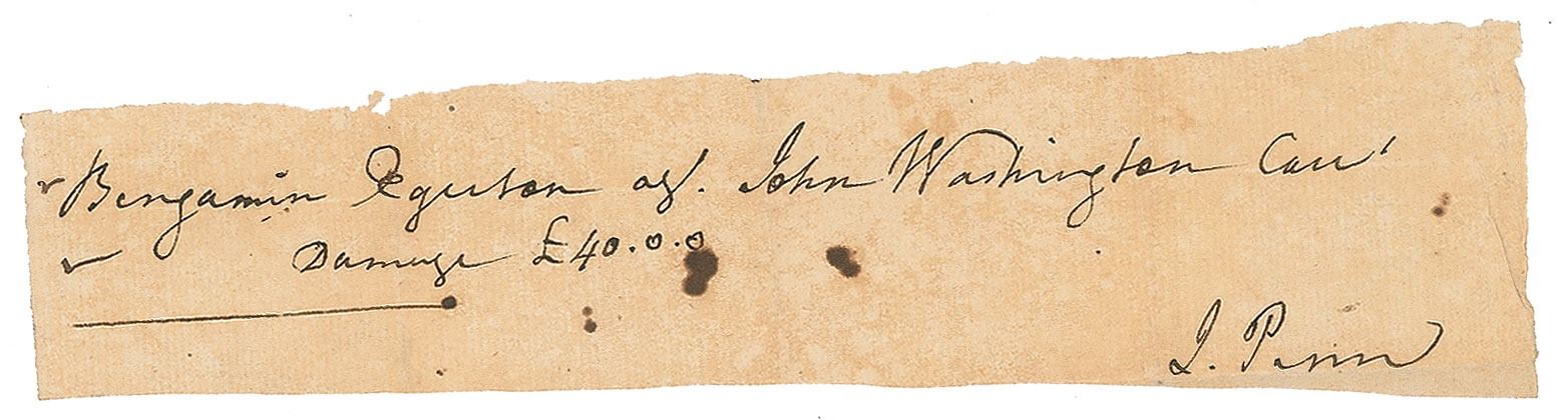 Brief autograph document signed “J. Penn,” one page, 7.75 x 2, no date. Partial document relating to the cost of a lawsuit: "Benjamin Egerton ag. John Washington Carr, Damage £40.0.0." Signed neatly at the conclusion by John Penn. In fine condition.