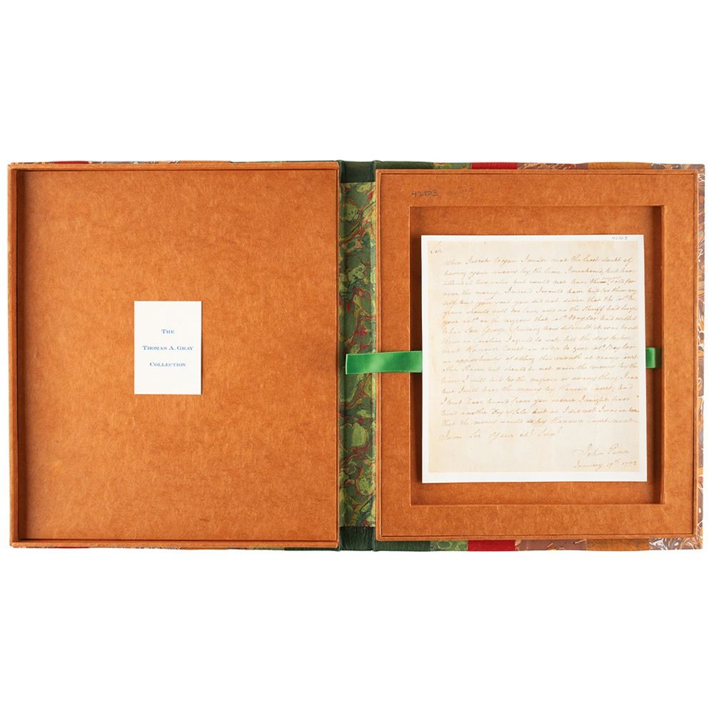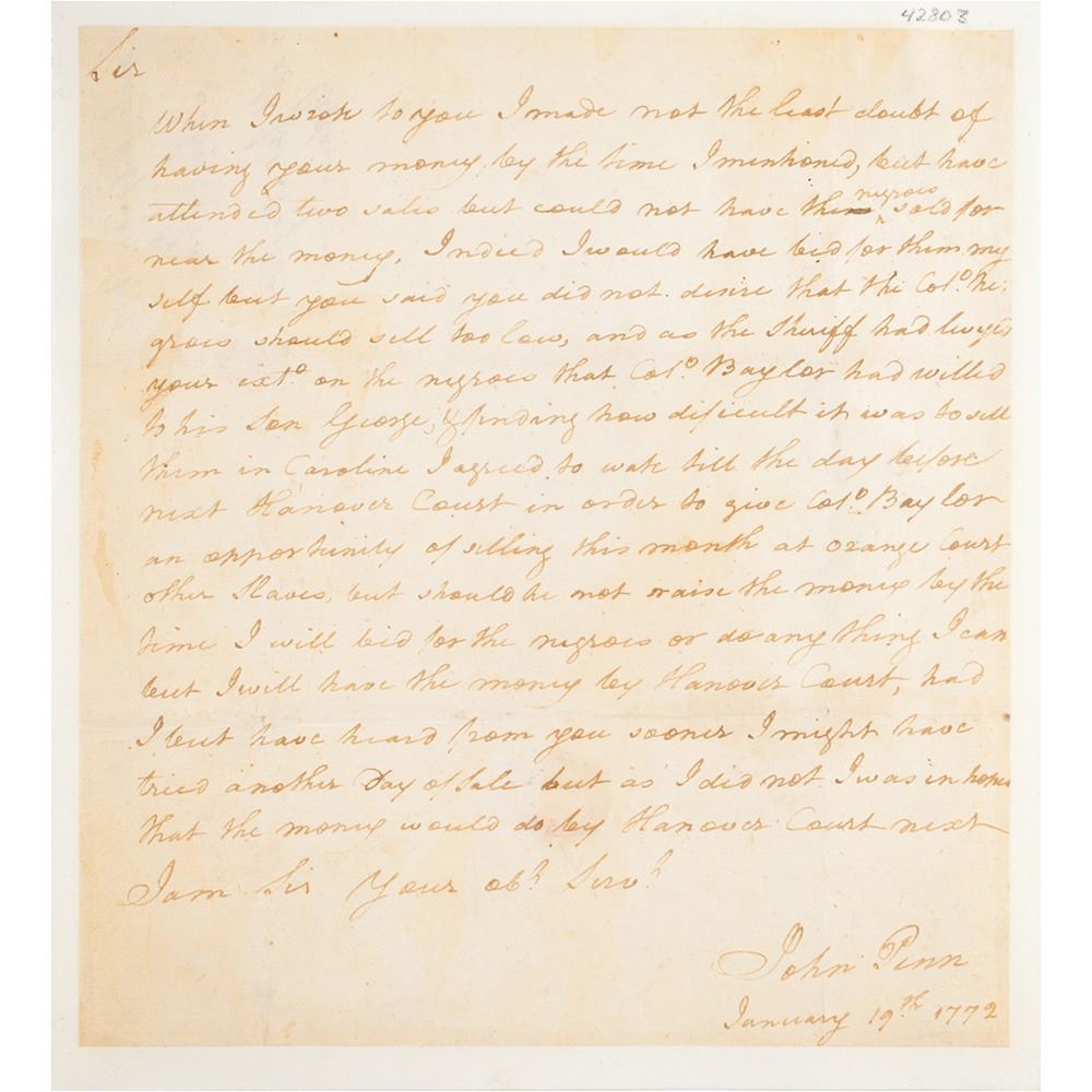 ALS, one page, 7 x 7.75, January 19, 1772. Addressed from Caroline, Virginia, a handwritten letter to an unidentified recipient discussing the sale of some of Col. John Baylor's slaves, in part: "When I wrote to you I made not the least doubt of having your money by the time I mentioned, but have attended two sales but could not have the negroes sold for near the money. Indeed I would have bid for them myself but you said you did not desire that the Col. negroes should sell for low, and as the Sheriff had…your ext. on the negroes that Col. Baylor had will to his son George, & finding how difficult it was to sell them in Caroline, I agreed to wate till the day before next Hanover Court in order to give Col. Baylor an opportunity of selling this month at Orange Court other slaves, but should he not raise the money by the time I will bid for the negroes or do any thing I can but I will have the money by Hanover Court, had I but have heard from you sooner I might have tried another day of sale but as I did not I was in hope that the money would do by Hanover Court next.” Professionally inlaid into a slightly larger sheet. Includes a custom clamshell presentation case, with label to inside indicating that the letter derives from “The Thomas A. Gray Collection.” In fine condition.