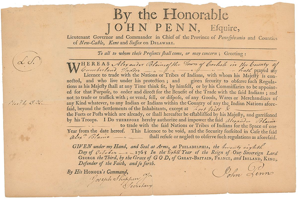 The last governor of colonial Pennsylvania (1729–1795). Partly-printed DS, one page, 12 x 8, October 28, 1768. Lieutenant Governor Penn grants Alexander Blaine a “License to trade with the Nations or Tribes of Indians, with whom his Majesty is connected, and who live under his protection.” The license stipulated that Blaine was "not to trade or traffick with; or vend, sell, or dispose, of any Goods, Wares or Merchandizes of any Kind whatever, to any Indian or Indians within the Country of any the Indian Nations aforesaid, beyond the Settlements of the Inhabitants, except at Fort Pitt & the Forts or Posts which are already, or shall hereafter by established by his Majesty, and garrisoned by his Troops.” In very good condition, with intersecting folds, one through a single letter of signature, rough top edge, a few partial fold separations, and some scattered toning.