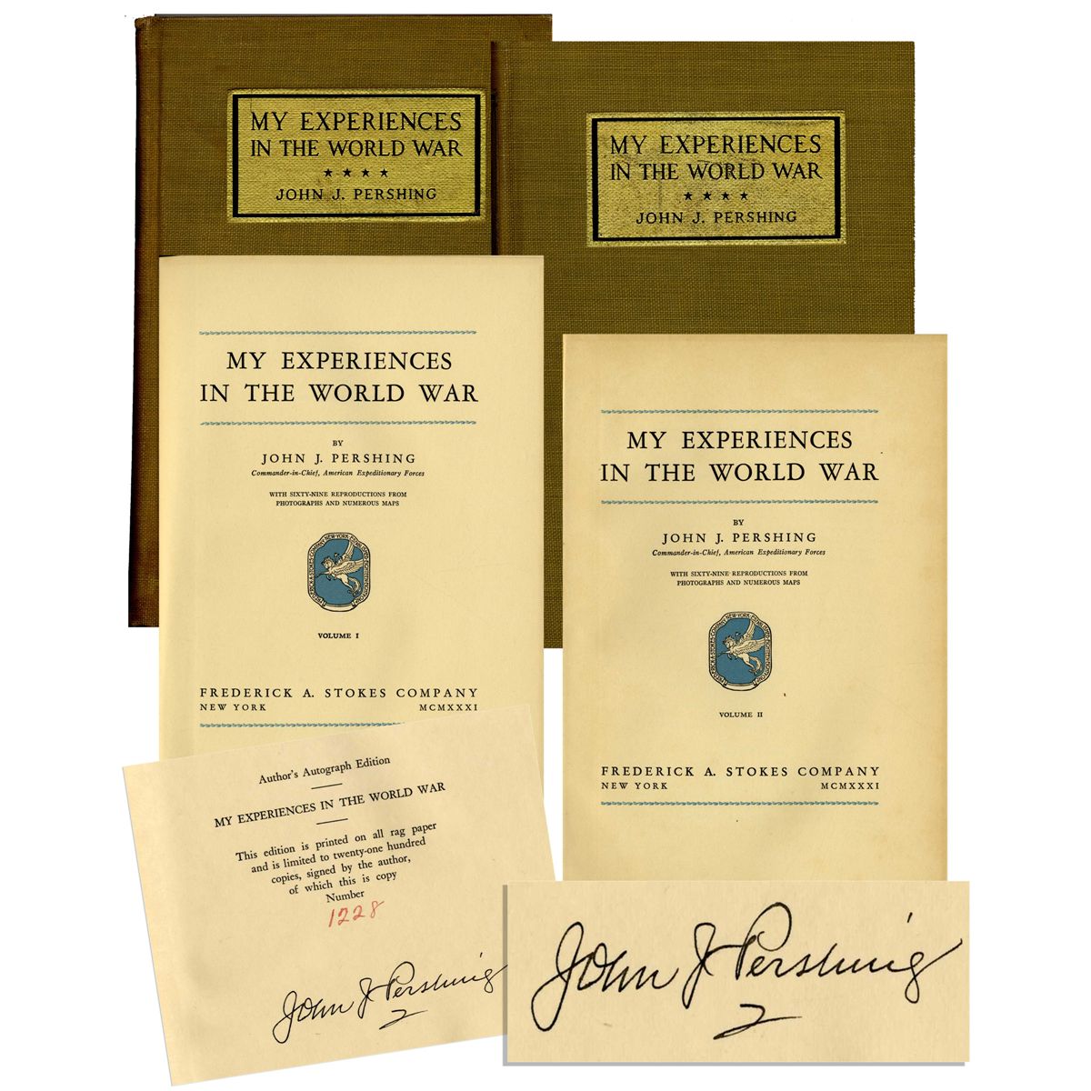 Signed copy of John J. Pershing's book ''My Experiences in the World War'' relating his experiences commanding American troops in World War I. Frederick A. Stokes Company: New York: 1931. Signed clearly in black ink: ''John J Pershing'' below limited edition copy number 1228 on the limitation page. The two volumes run 436pp. and are illustrated with photos and maps. 6.5'' x 9.5'' book, bound in brown cloth boards, is lettered in black on gilt with gilt top edge. Mild foxing and toning; overall very good condition. With PSA/DNA COA.