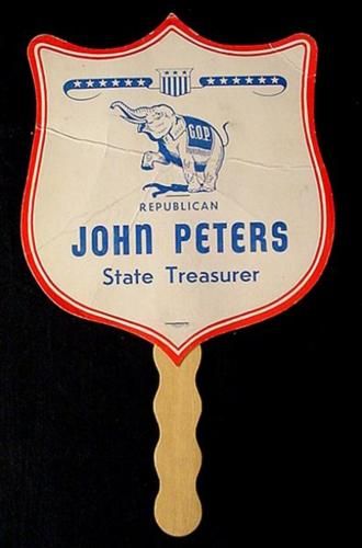 Here is a campaign fan style sign from John Peters Republican for State Treasurer. It is in fair condition, with some wrinkles. It is paperboard stapled onto a wood handle, and is 11 1/2" x 6" wide. We do not know the age or origin of this sign, but it should make good research for political historian.