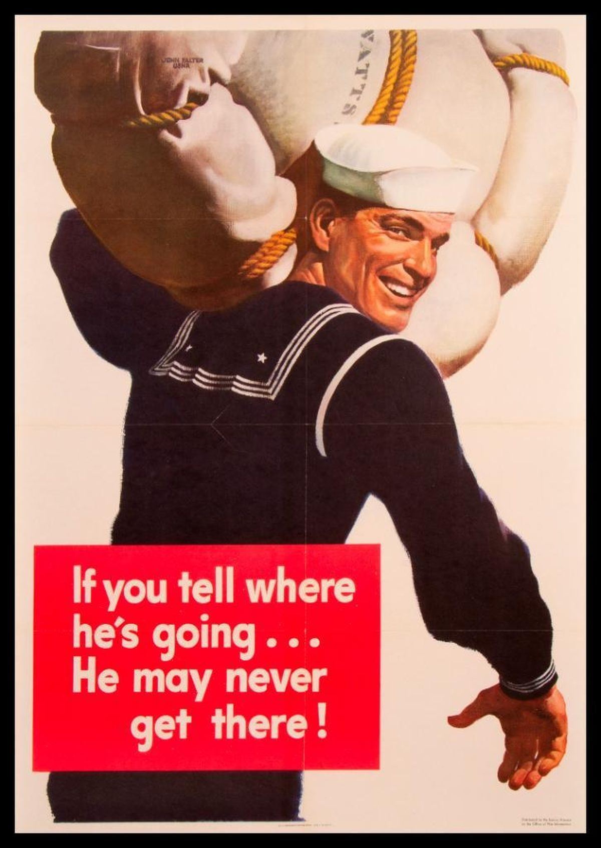 Vintage World War II Poster. If you tell where he's going...,Falter, John, USNR. Paper size: 31 x 23 inches. Linen backed. Condition: as per photograph.