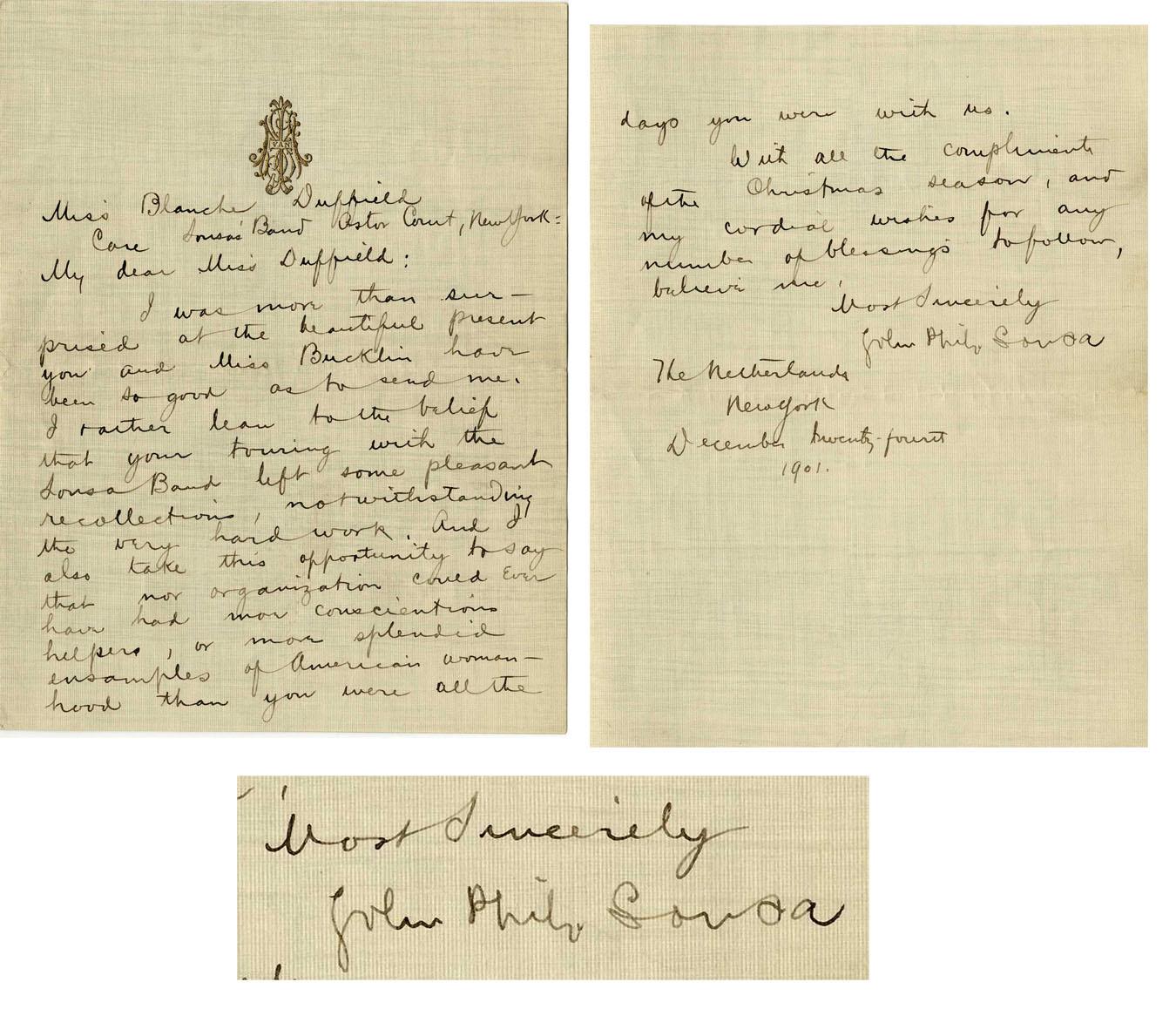 Composer John Philip Sousa autograph letter signed, dated 24 December 1901. Written to stage actress Blanche Duffield, letter reads in part: ''…I rather lean to the belief that your touring with the Sousa Band left some pleasant recollecting…I also take this opportunity to say that no organization could ever have had more conscientious helpers, or more splendid examples of American womanhood than you were all the days you were with us…'' Signed ''John Philip Sousa''. Card-style letter measures 5'' x 6.5'', with even toning throughout.