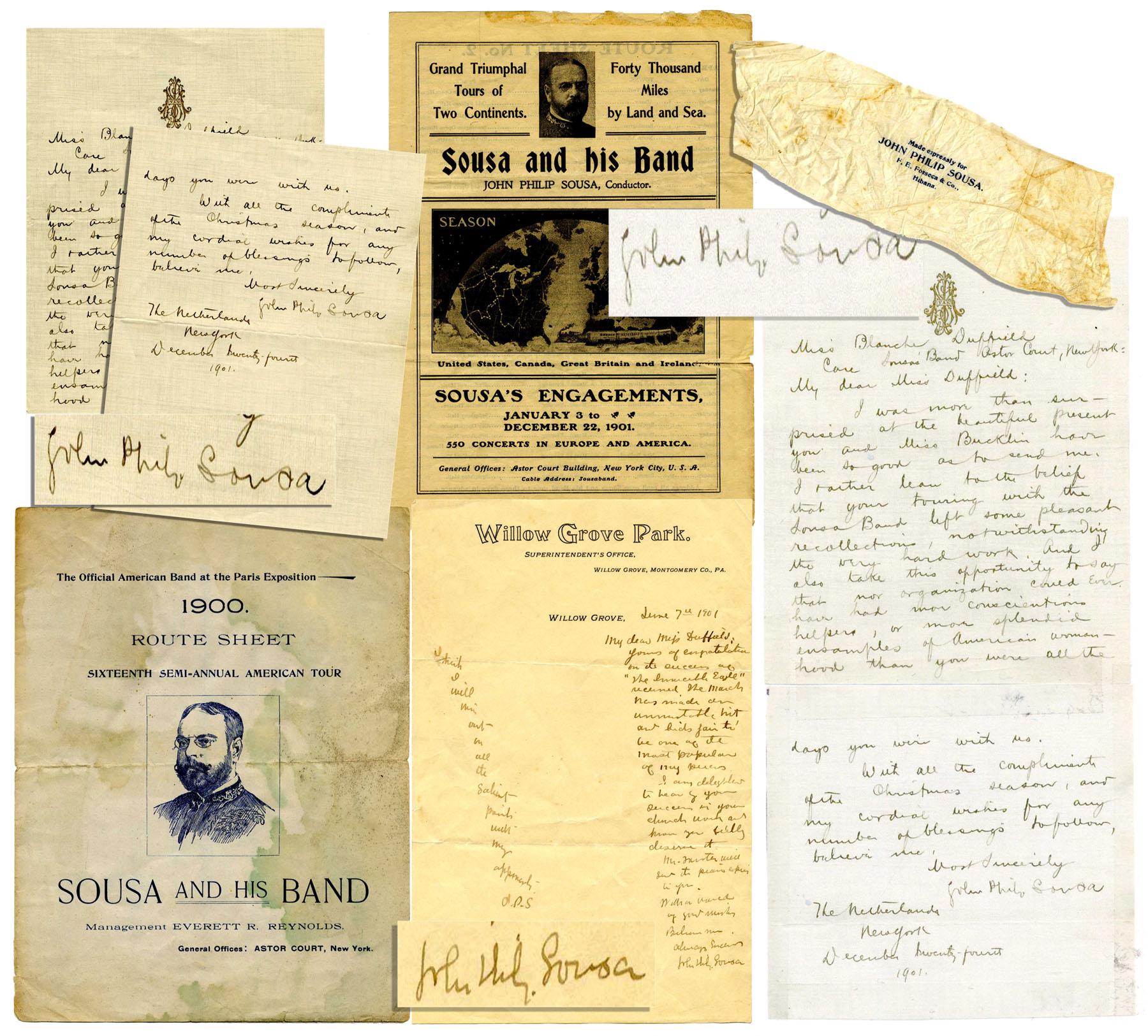 John Philip Sousa autograph letter twice-signed ''John Philip Sousa'' and again ''J.P.S''. Letter is dated 7 June 1901, written to stage actress Blanche Duffield. Letter written on Willow Grove Park letterhead discusses a recent Sousa march, ''…success of 'The Incredible Eagle'…the march has made a hit and bids fair to be one of the most popular of my songs…'' Measures 8'' x 5''. Lot also includes two route sheets and a personalized cigar wrapper. Letter contains some creasing. Overall very good condition.