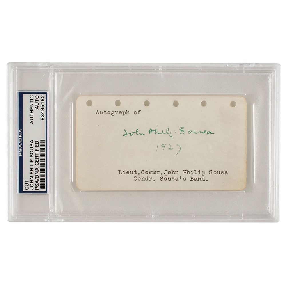 Ink signature, "John Philip-Sousa, 1927,†on an off-white 4.5 x 2.5 sheet. In fine condition. Encapsulated in a PSA/DNA authentication holder.