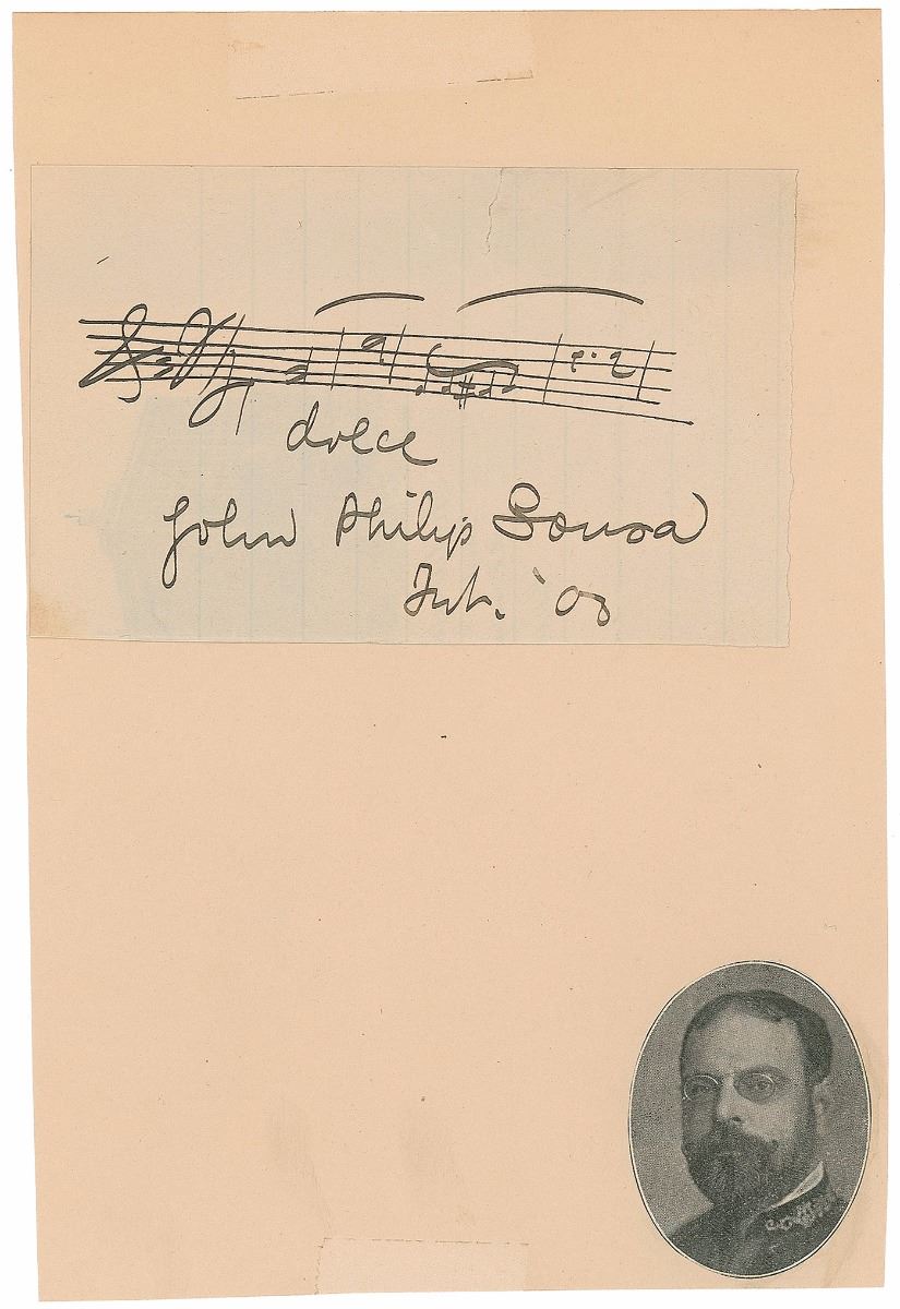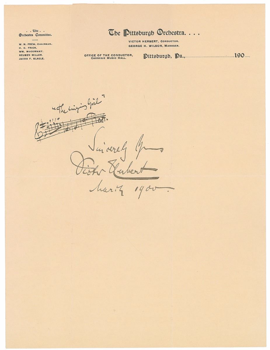 Desirable pair of AMQSs: first, an AMQS an on off-white 4.75 x 3 lightly-lined slip, signed at the conclusion, “John Philip Sousa, Jul. ‘00.” Sousa pens five bars of music, adding below, “dolce.” Second is an AMQS on an off-white 8 x 10.5 sheet of The Pittsburgh Orchestra letterhead, signed in black ink, “Sincerely Yours, Victor Herbert, March 1900.” Herbert pens fours bars of music, titling it above, “’The Singing Girl.’” The Sousa slip is affixed along the top edge to an off-white 5.25 x 8 sheet bearing an affixed image of the composer in the lower right corner. A small repaired tear to top edge of the Sousa slip, and partial separations to intersecting folds (passing through the tips of the signature) and slight show-through from mounting remnants to reverse of the Herbert sheet, otherwise overall fine condition.