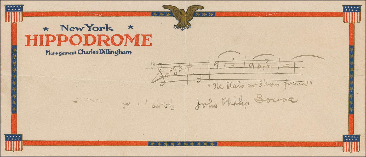 AMQS on an off-white 9.5 x 4.25 patriotic mailing envelope from the Hippodrome in New York. Sousa pens four bars from ‘The Stars and Stripes Forever,’ signing underneath, “John Philip Sousa.” Central horizontal and vertical fold, a uniform shade of mild toning, and mild mirroring of signature from premature folding, otherwise fine condition. Accompanied by the original mailing envelope, as well as a news clipping regarding Sousa’s birthday celebration at the Hippodrome. Sousa, managing to take time from a busy schedule, thankfully chose his most popular work in compliance with an autograph request.