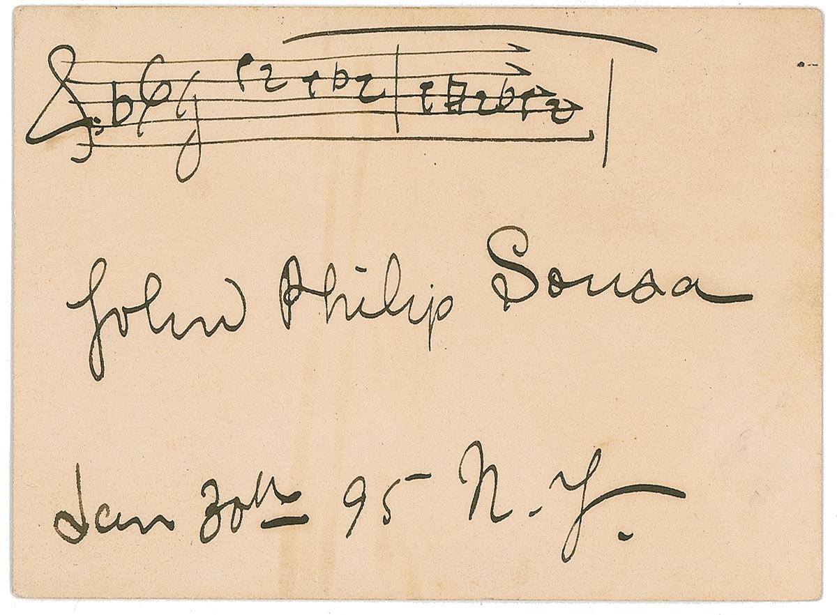 AMQS on an off-white 3.25 x 2.5. Sousa pens three bars of an unidentified work, signing underneath, “John Philip Sousa, Jan 30th, 95 N.Y.” Uniform toning, with a few heavier streaks through middle name of signature, otherwise fine condition.