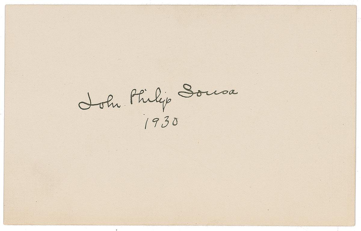 Crisp ink signature, “John Philip Sousa 1930,” on an off-white 5 x 3 card. In fine condition, with a uniform shade of mild toning.