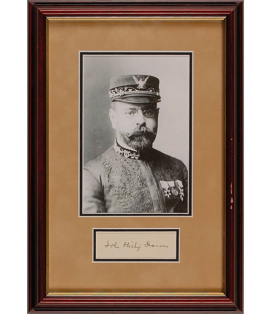 Ink signature, “John Philip Sousa,” on an off-white card. Double suede matted and framed with a portrait of Sousa in uniform to an overall size of 8.25 x 12. In fine condition.