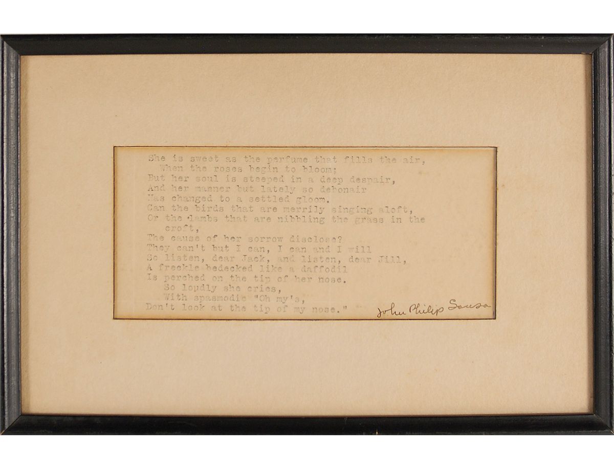 Signed at the conclusion by Sousa. Matted and framed to an overall size of 10.25 x 7. In very good condition, with light intersecting folds and uniform toning.